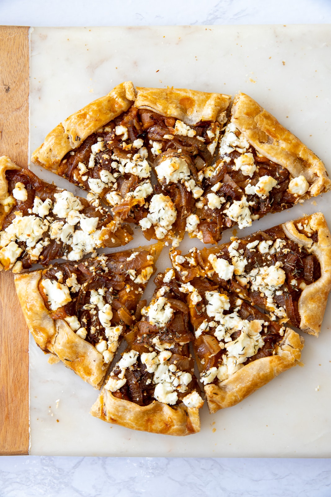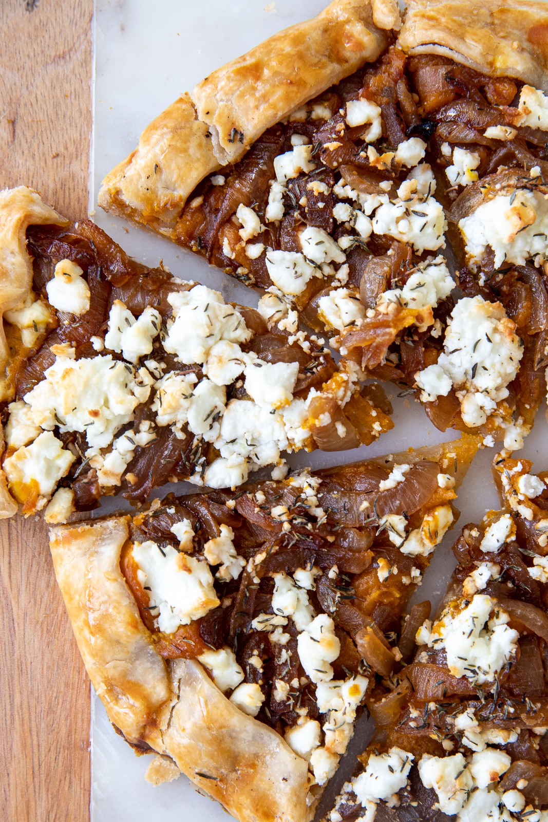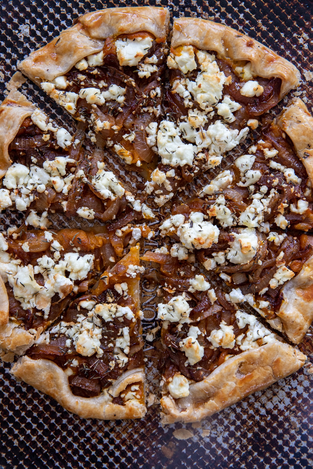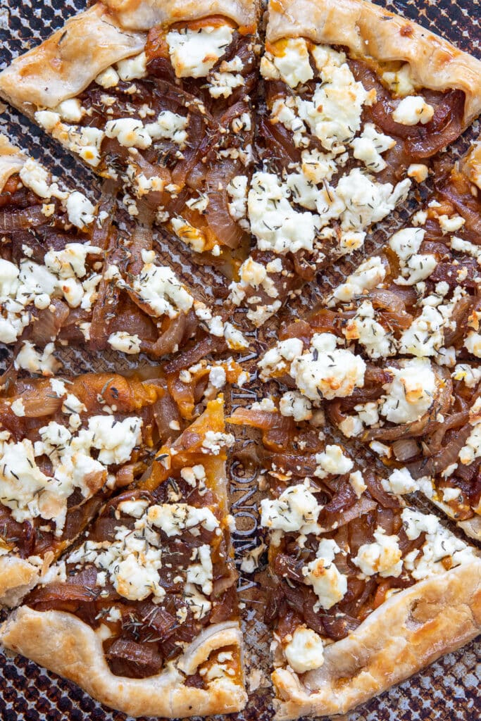 Roll out your pie crust on parchment paper. Spread pumpkin mixture in the center, leaving a 1.5-inch border. Top with caramelized onions, goat cheese crumbles, and thyme.
